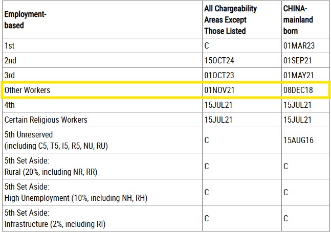 - EB-3 Other Workers: 01 November 2021. Moved forward from February 2026 Visa Bulletin.
